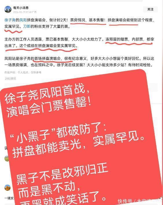 主办方工作人员透露,连预留的赠票、内部票都拿出来卖了。大大小小太给力,硬是把一个拼盘场,撑出了个人演唱会的架势。你说这事有意思吧?那位小黑子发文说:这是徐子尧的首场拼盘演唱会,有纪念意义,好多大大小小想留个美好回忆,所以票房爆满,也在预料之中。什么“也在预料之中”——当初黑的时候,可不是这么说的。这话听着像是在认输,实际也是认输。徐子尧一个刚冒头的新人,能把拼盘场卖光,放在哪个年代都算稀罕事。这事儿最讽刺的地方就在这儿:小黑子想黑“没人看”,结果现场爆满;想黑“靠赠票”,结果连内部票都被粉丝抢光了。这种“想黑却找不到切入点”的无力感,大概就是他暂时停火的真正原因。